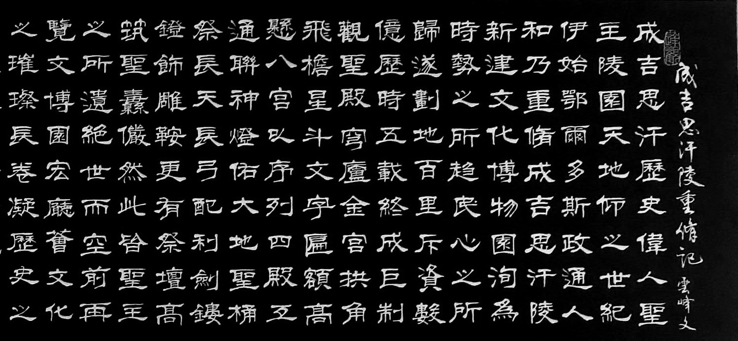 成吉思汗,历史伟人。圣主陵园,天地仰之。世纪伊始,鄂尔多斯政通人和,乃重修成吉思汗陵,新建文化博物园。洵为时势之所趋,民心之所归。遂划地百里,斥资数亿,历时五载,终成巨制。观圣殿,穹庐金宫,拱角飞檐,星斗文字,匾额高悬。八宫以序列,四殿互通联,神灯佑大地,圣桶祭长天。长弓配利剑,鏤镫饰雕鞍。更有祭坛高筑,圣纛俨然。此皆圣主之所遗,绝世而空前。再览文博园,宏厅荟文化之璀璨,长卷凝历史之绵延。铁马嘶鸣,恍若耳际,金戈挥舞,犹在目前。弓挽月满,箭鸣星寒,遥想一代天骄,纵马扬鞭,驰骋欧亚,声震宇寰。功名聳玉阙,青史著河山。看胜地今朝,泽被苍生;茫茫大漠,绿野新妆;神奇热土,华章竞显。百姓相与乐,天人共和谐。圣主之裔,当秉天骄精神,赋历史新篇。钟灵毓秀,文韬武略,豪气贯长虹,胸襟纳百川。路漫漫,争光日月;风浩浩,直挂云帆。成吉思汗,英名永垂天地。鄂尔多斯,走向世界,正一往无前。
